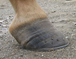 Thoroughbred with long toes. There is no doubt this horse would have some degree of lameness, probably forges. Note the crack in the hoof, caused by long toes.